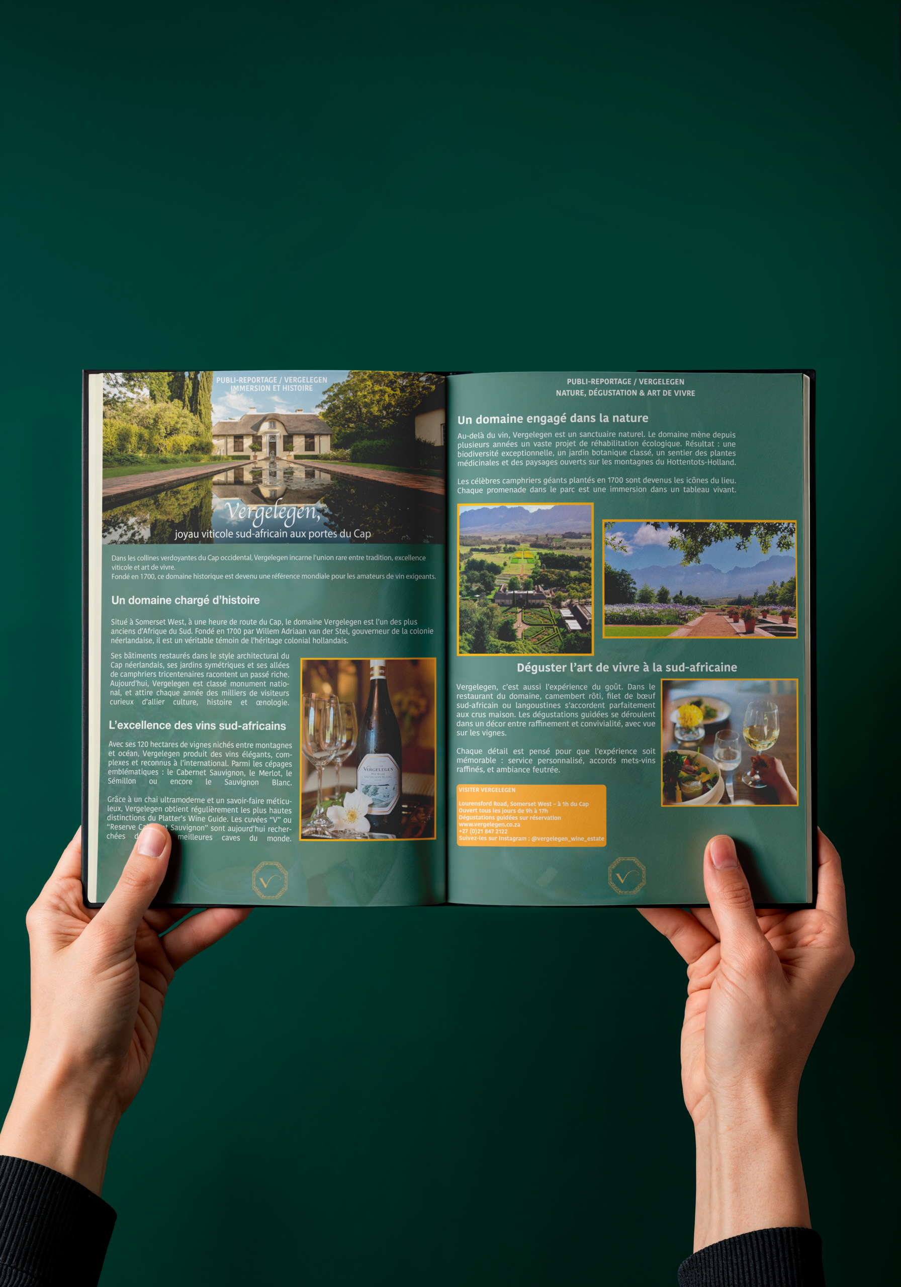 Ce traitement éditorial permet de positionner Vergelegen comme un domaine d’exception, en mettant en lumière son histoire, son savoir-faire et son art de vivre. Le format publireportage renforce la crédibilité du message et favorise une lecture engageante, propice à la projection et à l’envie de découverte dans un contexte de presse magazine.